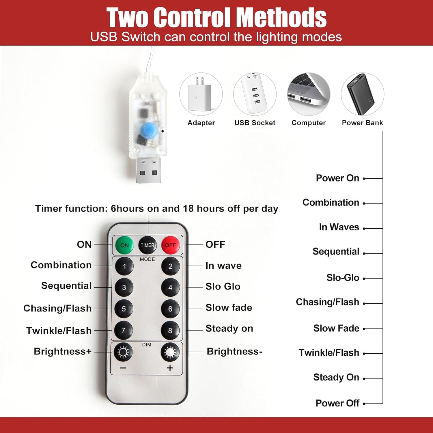 💡 8 Lighting Modes + Timer & Memory – Choose steady-on or 7 different blinking effects to match any mood. Press the button on the adapter to change modes; hold for 3 seconds until the green light shows to activate the timer. The built-in memory chip remembers your last setting—no need to reset every night.