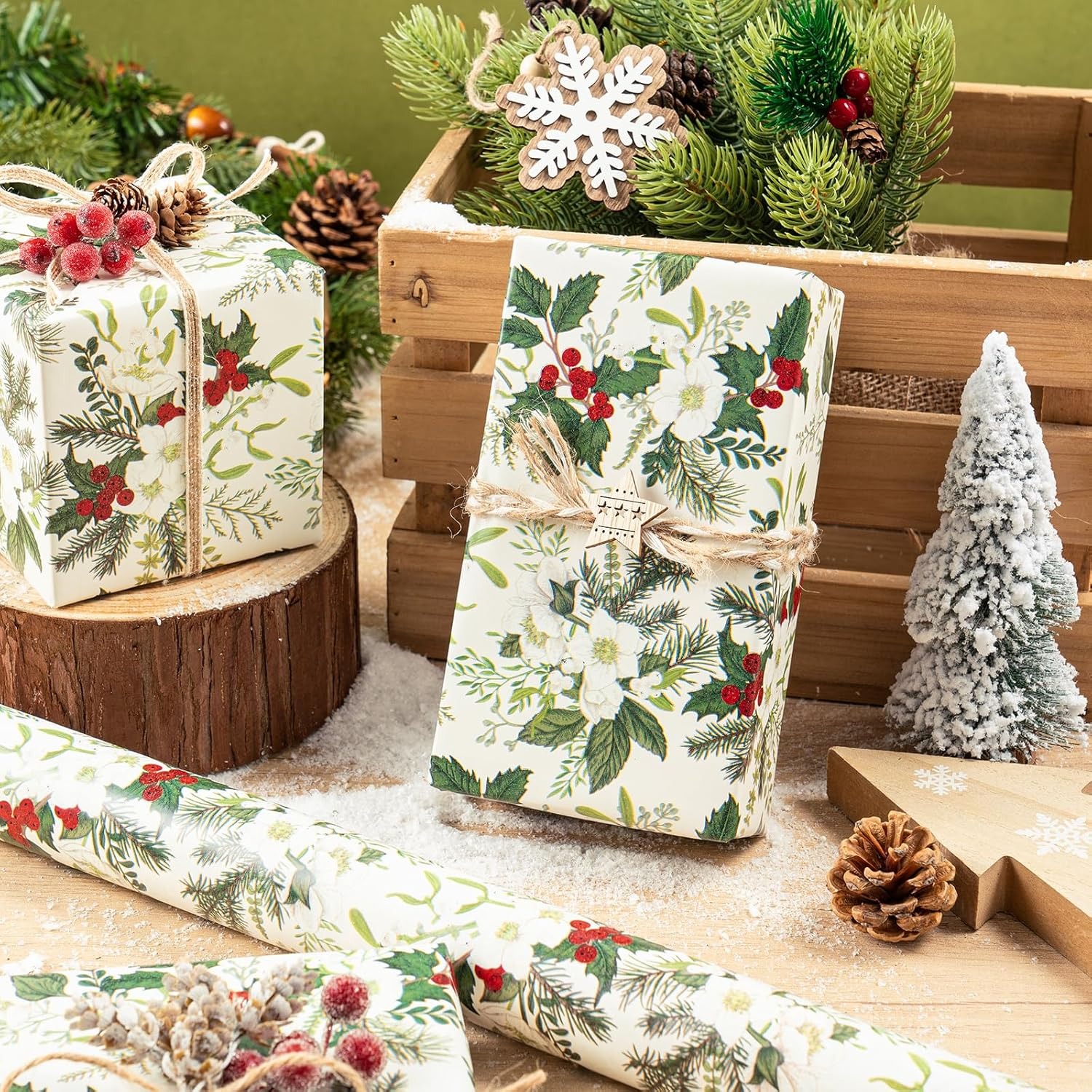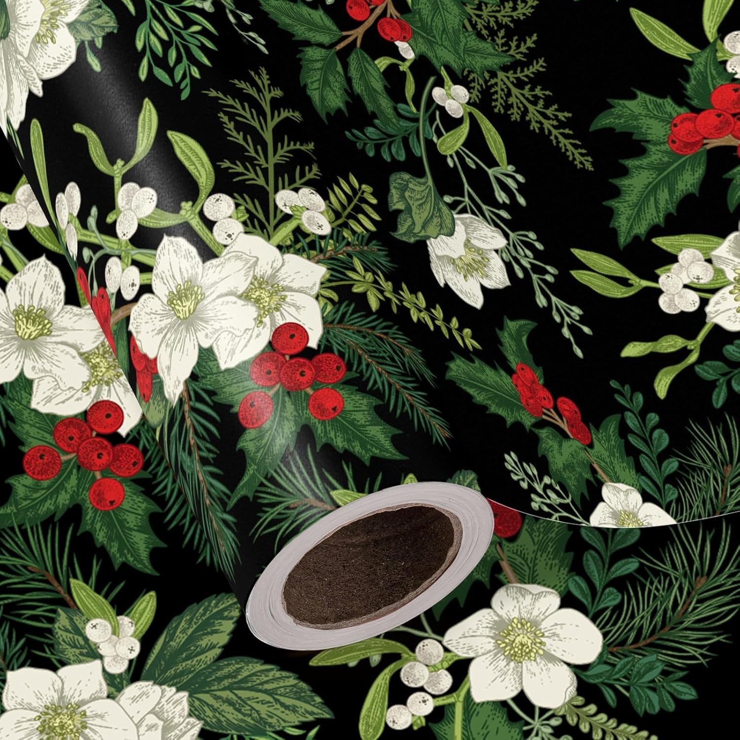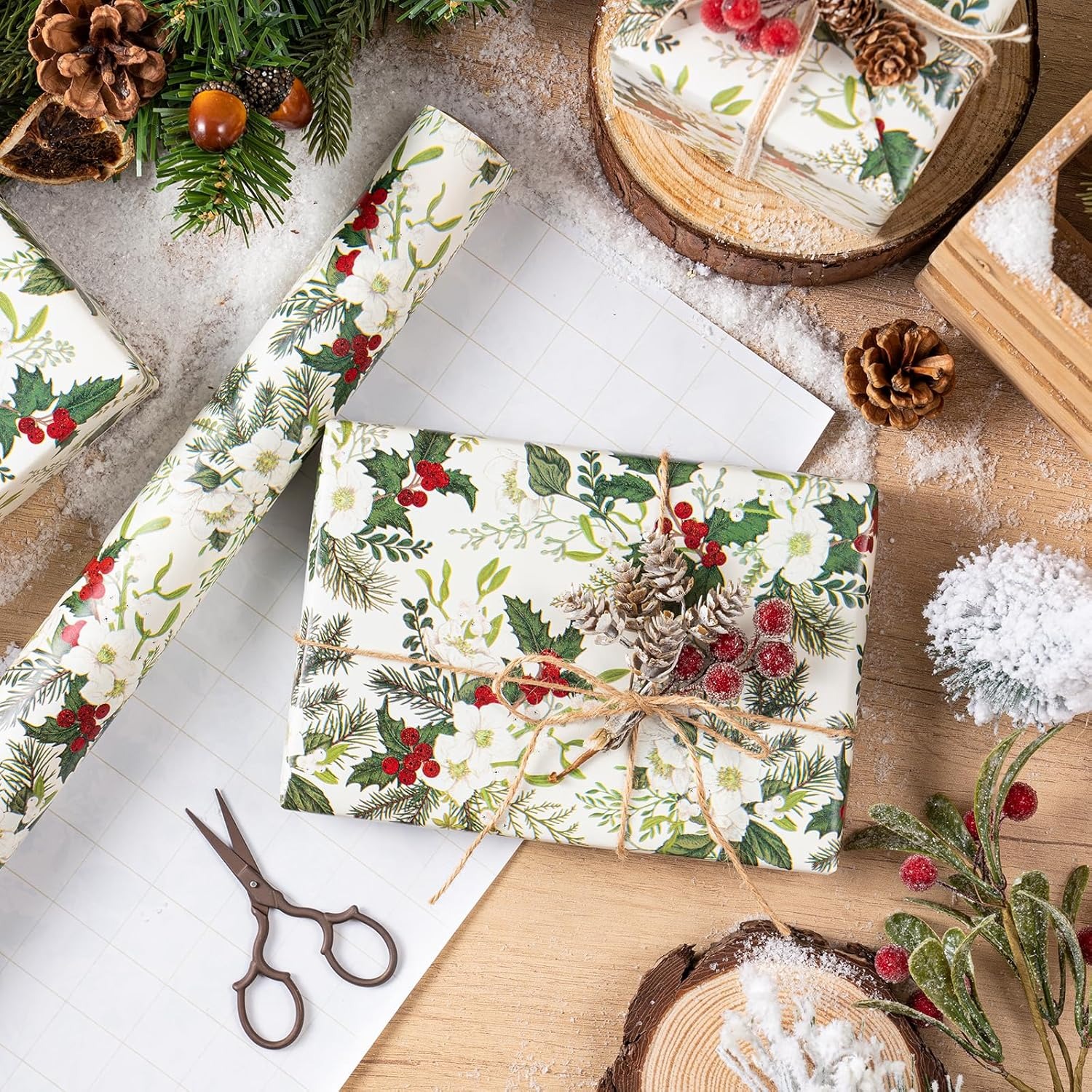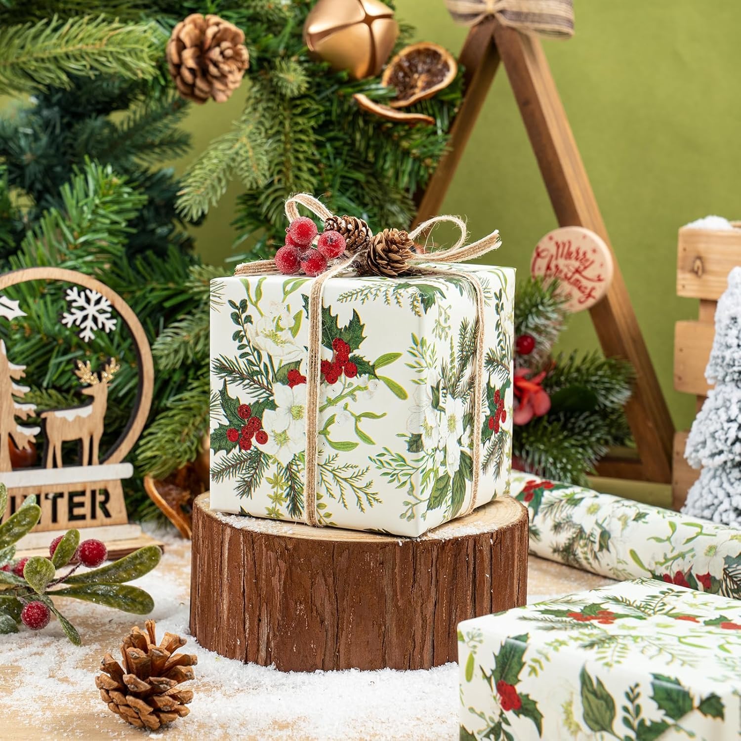 🎄 The charming mix of white florals, lush green leaves, and bright red berries makes every present look like a little piece of holiday art. Whether you’re wrapping for family, friends, or coworkers, this wrapping paper adds that magical finishing touch that makes gifts feel extra special. 🌟
