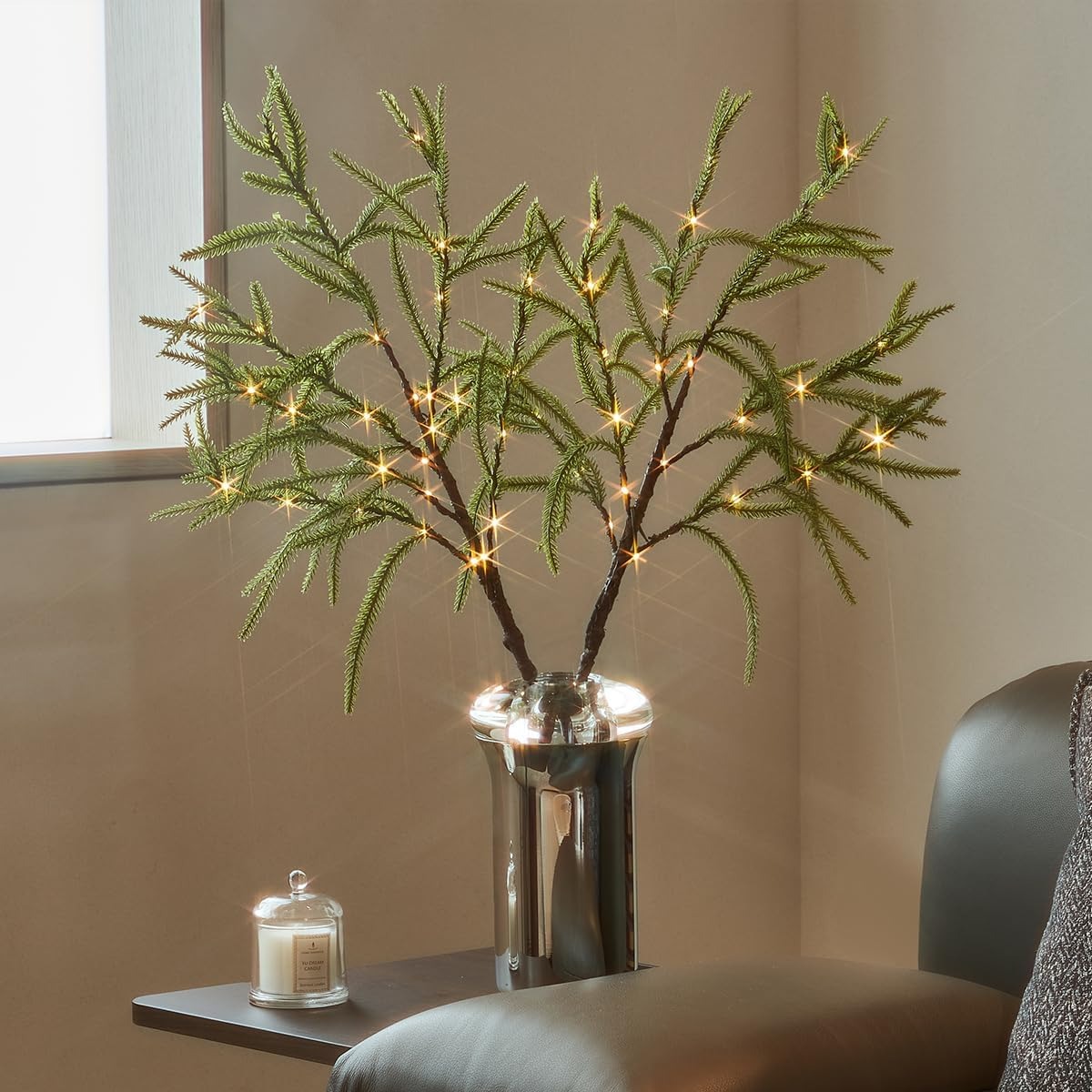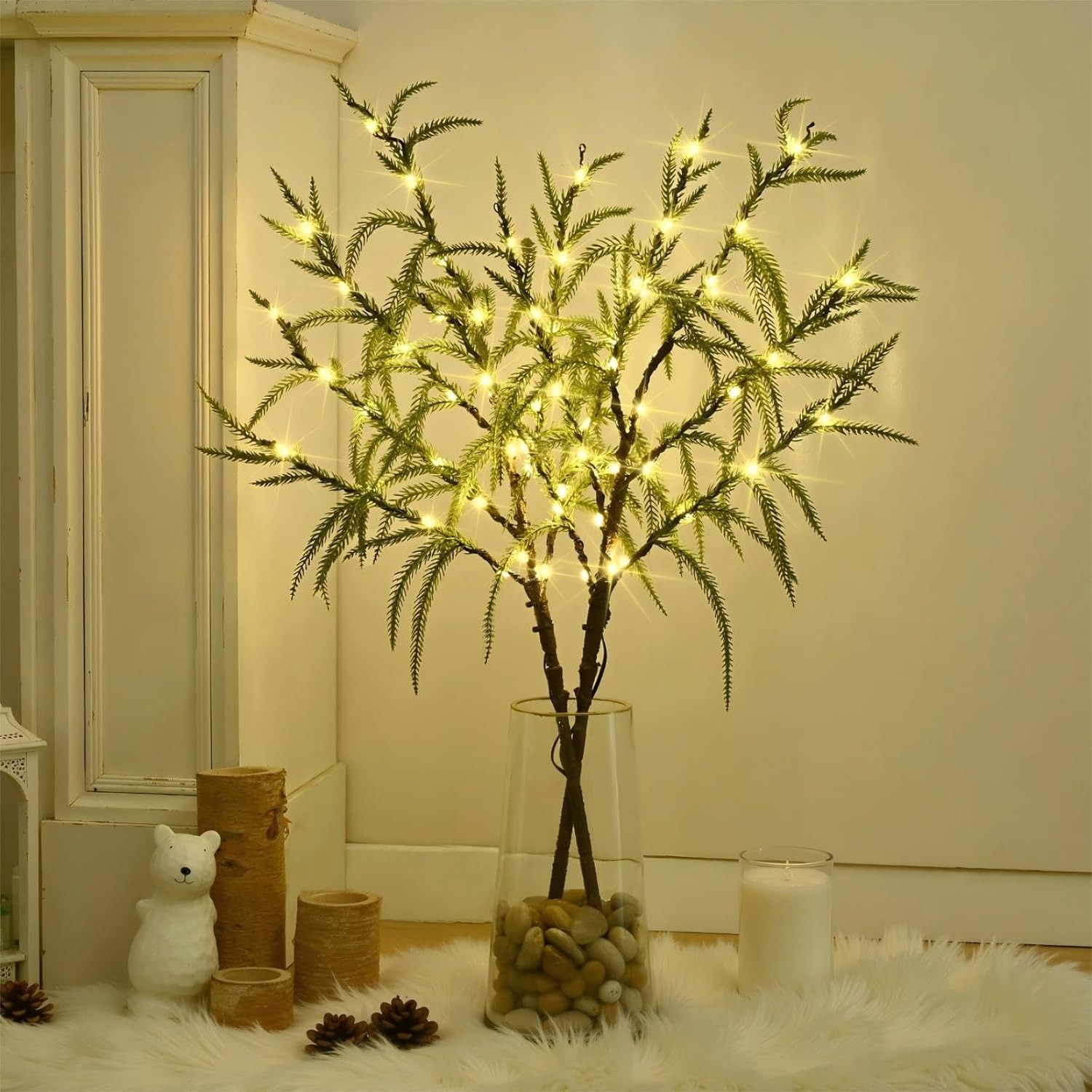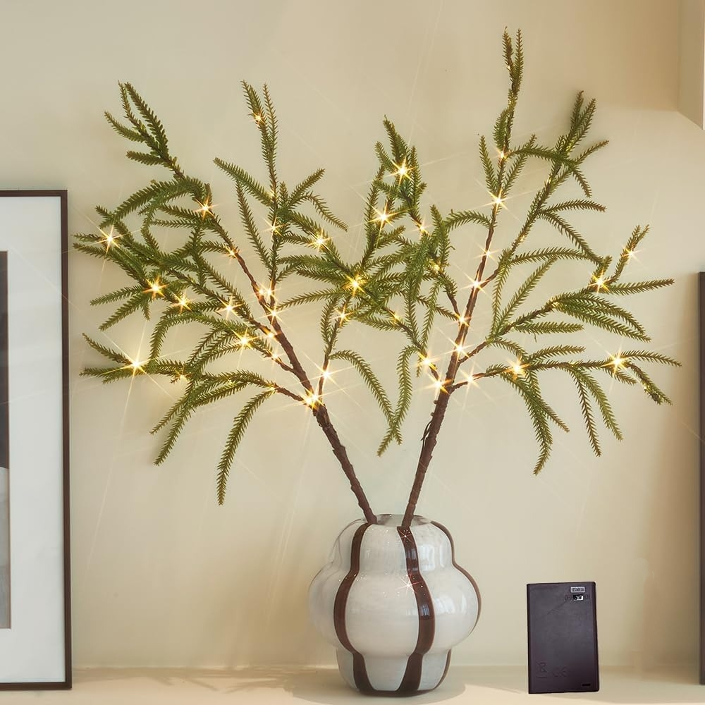 UNIQUE NORFOLK DESIGN: We combined the lighted branches with Norfolk branches, which have a soft touch and a realistic appearance, making them perfect for creating a warm Christmas decoration tone at home. The package includes 1 32-inch glowing Norfolk branches and a total of 60 warm bulbs.